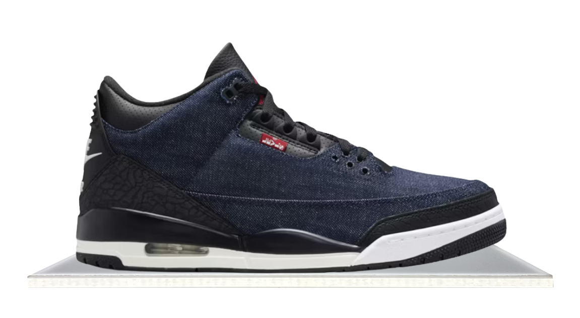 The Air Jordan 3 Levi’s Indigo delivers a dark-wash twist on a classic collaboration. Premium indigo denim panels are paired with tonal black elephant print for a clean, understated look, while Levi’s signature details like the Red Tab and dollar-bill graphic add collector-level character.