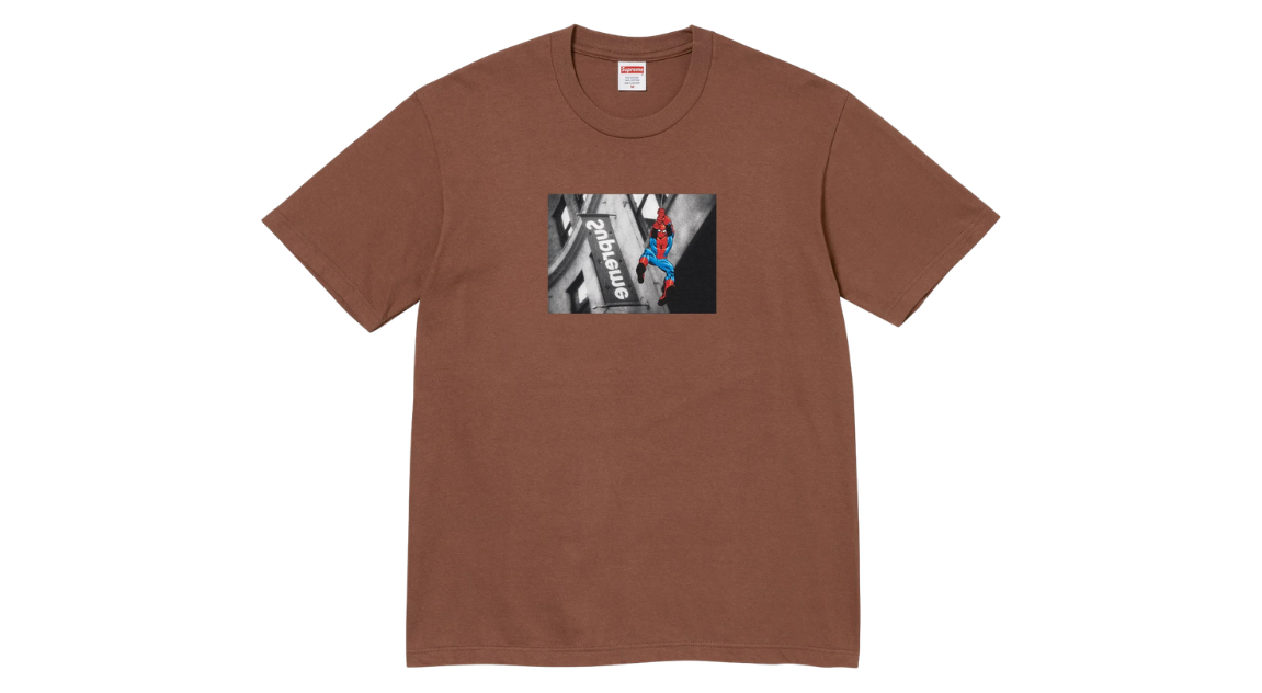 The Supreme Spider-Man Tee SS26 in brown brings comic-book energy to a warmer, earth-toned base. The bold Spider-Man graphic pops against the rich brown color, delivering a standout seasonal piece that blends nostalgia with unmistakable Supreme attitude.