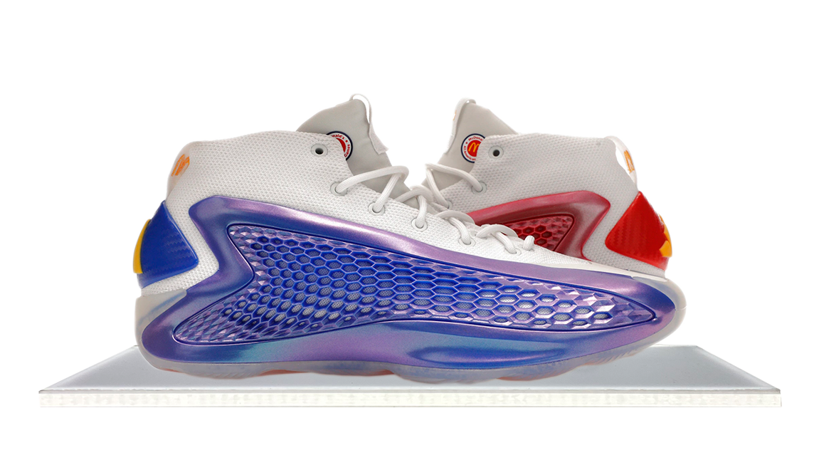 The adidas AE 1 'McDonald's All-American' pays homage to the prestigious high school basketball event. Anthony Edwards' debut signature sneaker features a mismatched color scheme, with white knit uppers, crimson TPU wings on the left shoe, and blue wings on the right. McDonald's golden arches adorn the heel pull tabs, while adidas' three-stripes logo is embossed on the molded heel counter. The cushioning includes Lightstrike foam in the forefoot and responsive Boost in the heel.