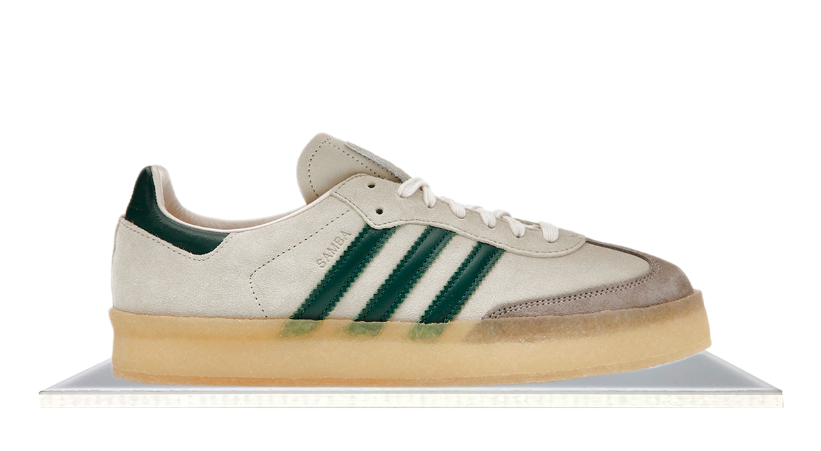 The exclusive Adidas Clarks 8th Street Samba by Ronnie Fieg in Chalk White Green. This collaboration reimagines the classic Samba with a unique blend of adidas and Clarks elements. The crepe rubber outsole, color-blocked design, and leather heel lining create a unified and distinctive look. Tri-branding by Ronnie Fieg, adidas, and Clarks on the tongue adds a premium touch to this standout silhouette.