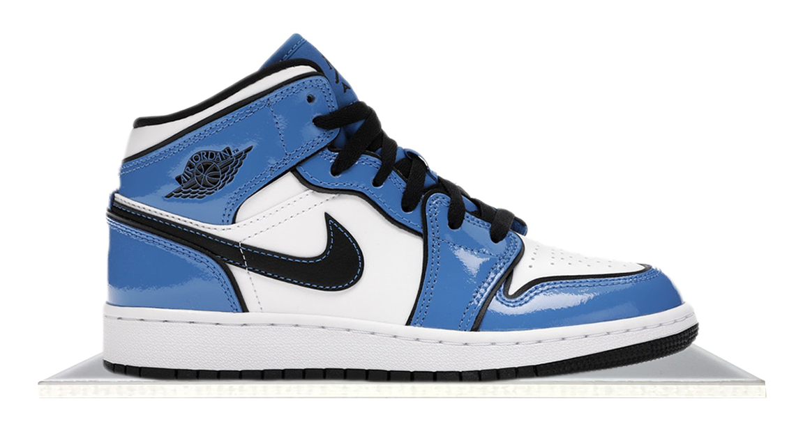 The Air Jordan 1 Mid Signal Blue showcases striking Signal Blue patent leather overlays. Complemented by white leather underlays and black piping, this design offers a vivid contrast. A black Jumpman on the tongue tag completes this retro gem.