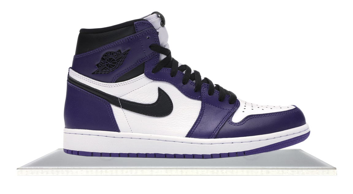 An incredible purple Air Jordan 1 colorway, that makes a resemblance to the Dunk High 1999's exclusive "City Attack". With a white base covered with purple layers, heel and toe cap, finished off with black swoosh, laces, cuff and details around the logo. The Air Jordan 1 Court Purple.