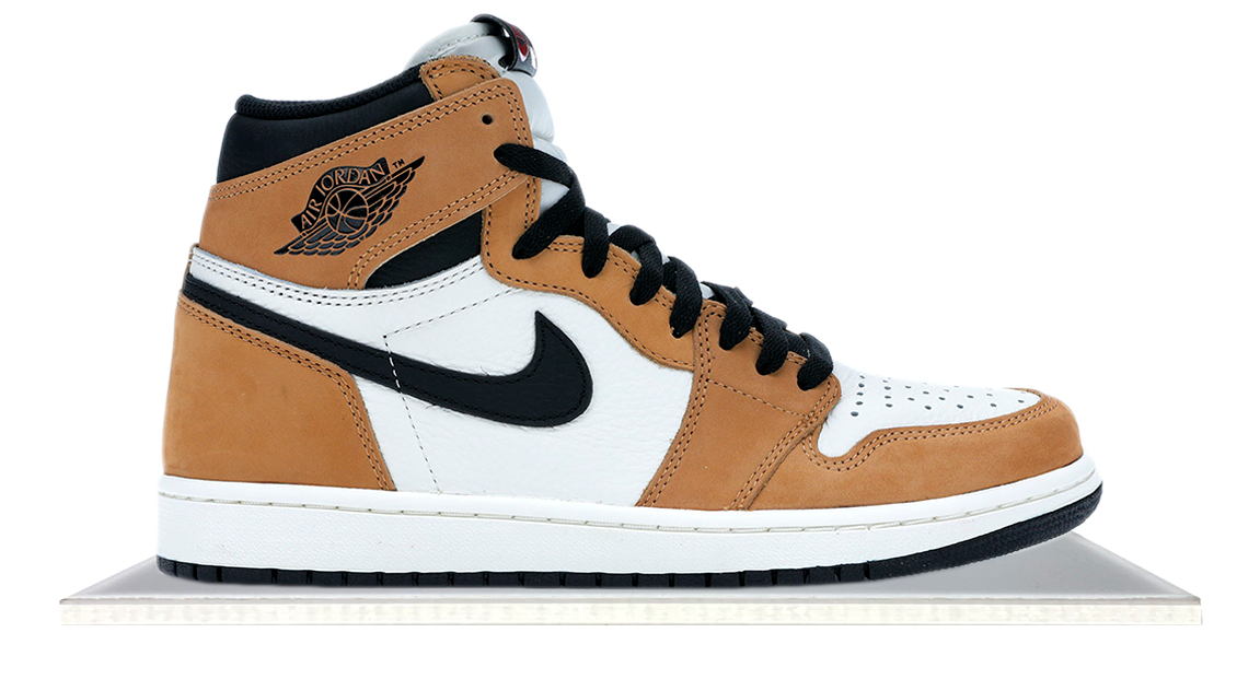 Celebrating Michael Jordan’s rookie of the year award with the Air Jordan 1 High "Rookie of the Year". It features a white and harvest/light brown leather upper, black Swoosh, white midsole, and a black outsole.