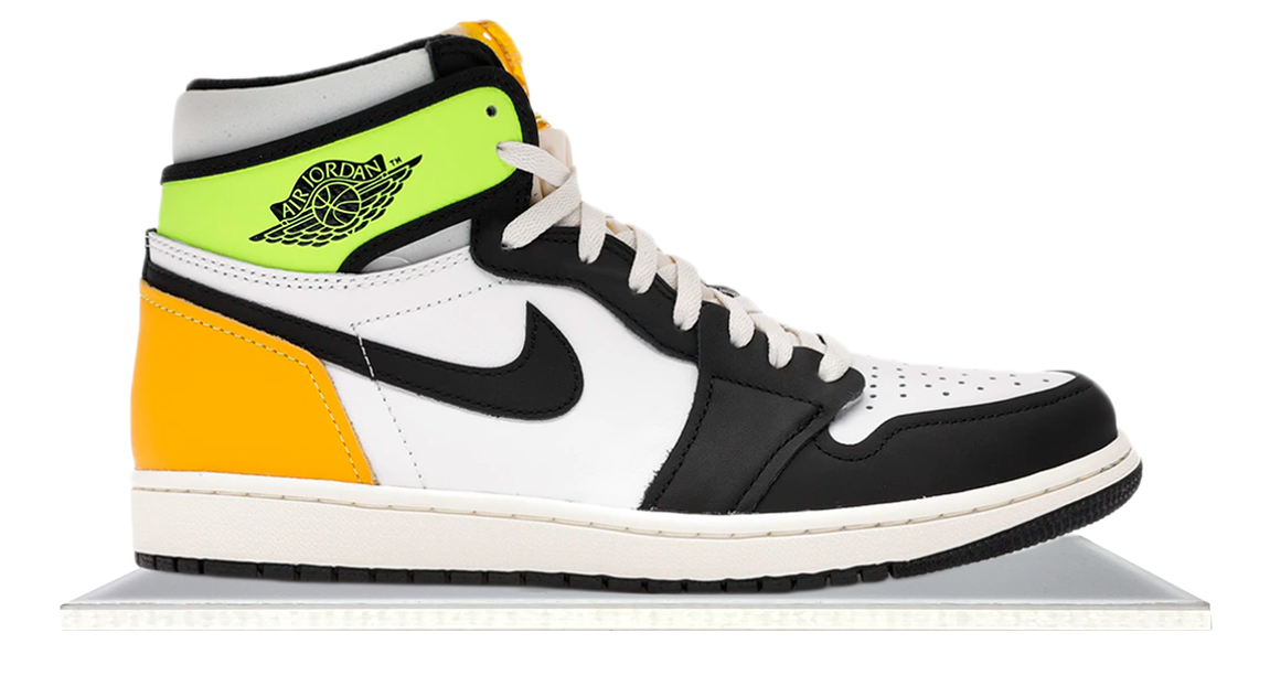 The Air Jordan 1 High Volt University Gold with a black and white front, while yellow and “volt” attacks the heel and collar of the sneaker.