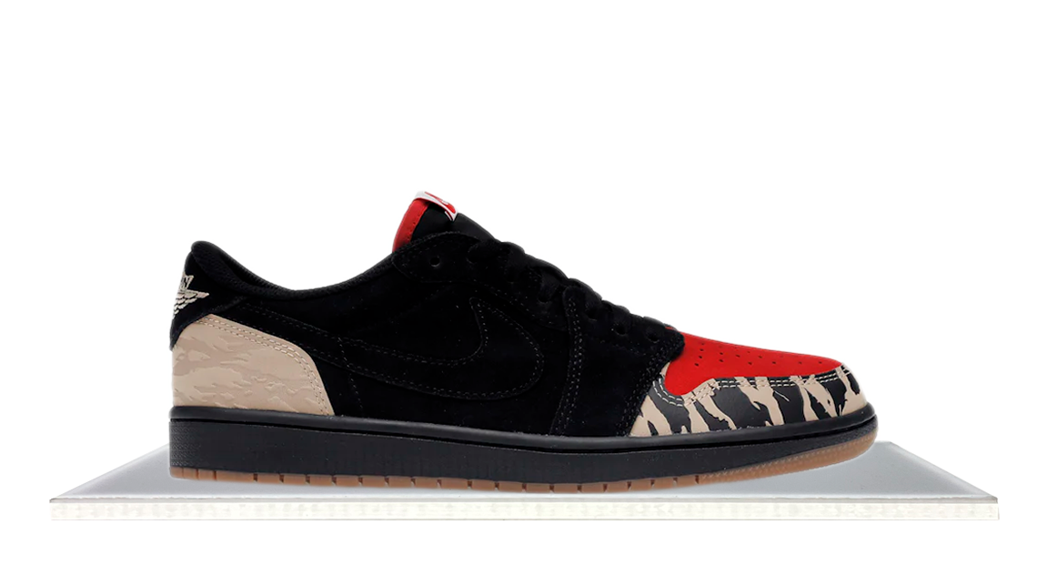 The Air Jordan 1 Low Solefly, released in December 2021, draws inspiration from the Florida Everglades' wildlife. Featuring a premium suede upper in black and red, it has striking patterns and beige debossed toe and heel wraps. Complete with SoleFly and Air Jordan logos on the heel tabs.