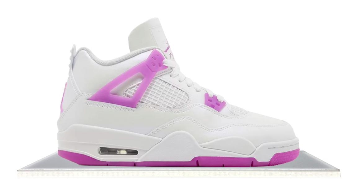 The Air Jordan 4 Retro 'Hyper Violet' features white leather with vivid violet accents on the eyelets, support wings, and Jumpman branding. It offers lightweight cushioning with a white midsole and visible Air-sole unit, while the violet outsole provides excellent traction.