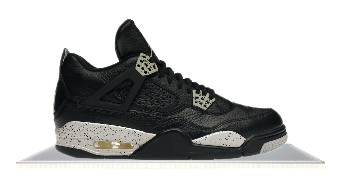 The Air Jordan 4 Retro Oreo Tech Grey 2015 features a black tumbled leather upper with tech grey accents and speckled details on the midsole and Wingtips. Perforated quarter panels replace the usual mesh, and the Jumpman logo is displayed on the heel and tongue in pale grey.