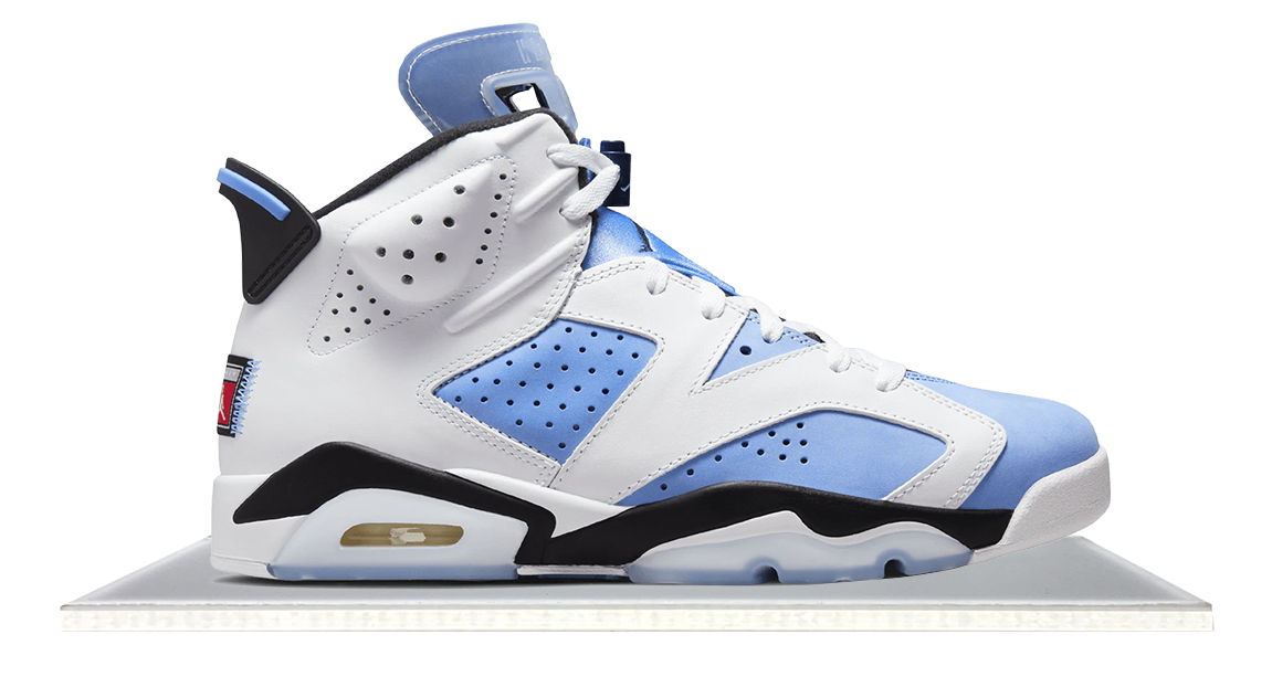 The Air Jordan 6 "UNC" Features the popular colors blue and white. On the base, a Light blue nubuck fabric, and with white leather overlays. Additional details include a tribal graphic on a translucent tongue that's echoed inside on the insole. A Jordan patch on the heel and an icy blue sole complete the Tinker Hatfield design.