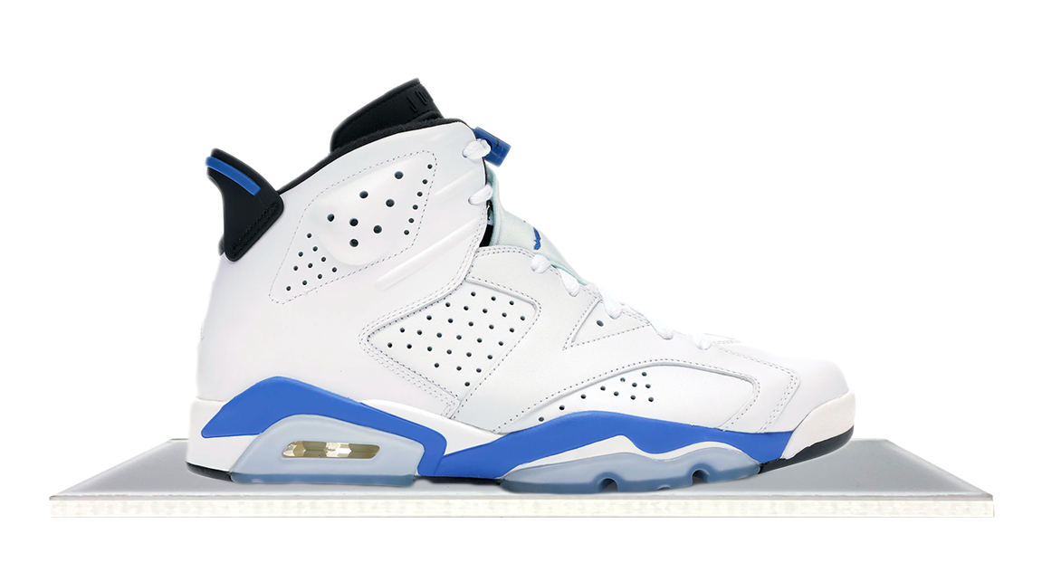 The Air Jordan 6 Retro Sport Blue (2014) combines white leather with perforated side panels, a rubber outsole for durability, and a visible air cushioning midsole for comfort. It includes a lace-lock system, heel pull tab, and features Jumpman logos on the tongue and heel.