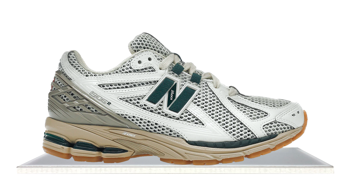 New Balance 1906R White Green Cream features a breathable mesh base is complemented by white leather paneling. With a classic color palette of light grey midsole, cream outsole, and gum rubber for traction, this shoe showcases green woven laces, a distinct "N" emblem, and a TPU heel cage. The cream N-ERGY unit with green accents offers both style and comfort.