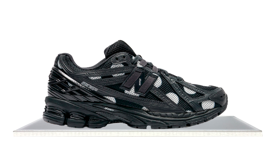 The New Balance 1906R blends heritage with modern design, featuring a shock-absorbing N-ergy outsole, Stability Web for arch support, and ACTEVA LITE midsole. This version sports an all-black colorway with white polka dots for a stylish touch.