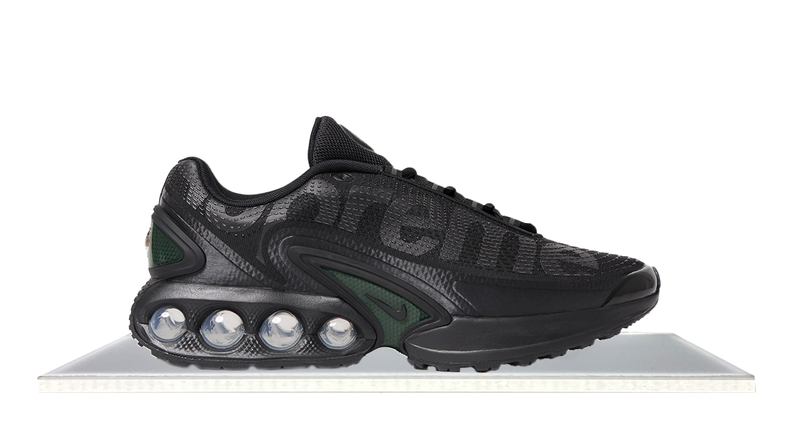 Crafted exclusively for Supreme, the Air Max DN Supreme showcases a mesh upper adorned with a reflective printed logo, complemented by a TPU toe cap, shank at the midsole, and heel clip. It boasts a durable rubber outsole and Phylon midsole with transparent air bags for enhanced cushioning. Co-branded footbed and tongue logos, along with mesh collar and tongue lining, add to its premium appeal.