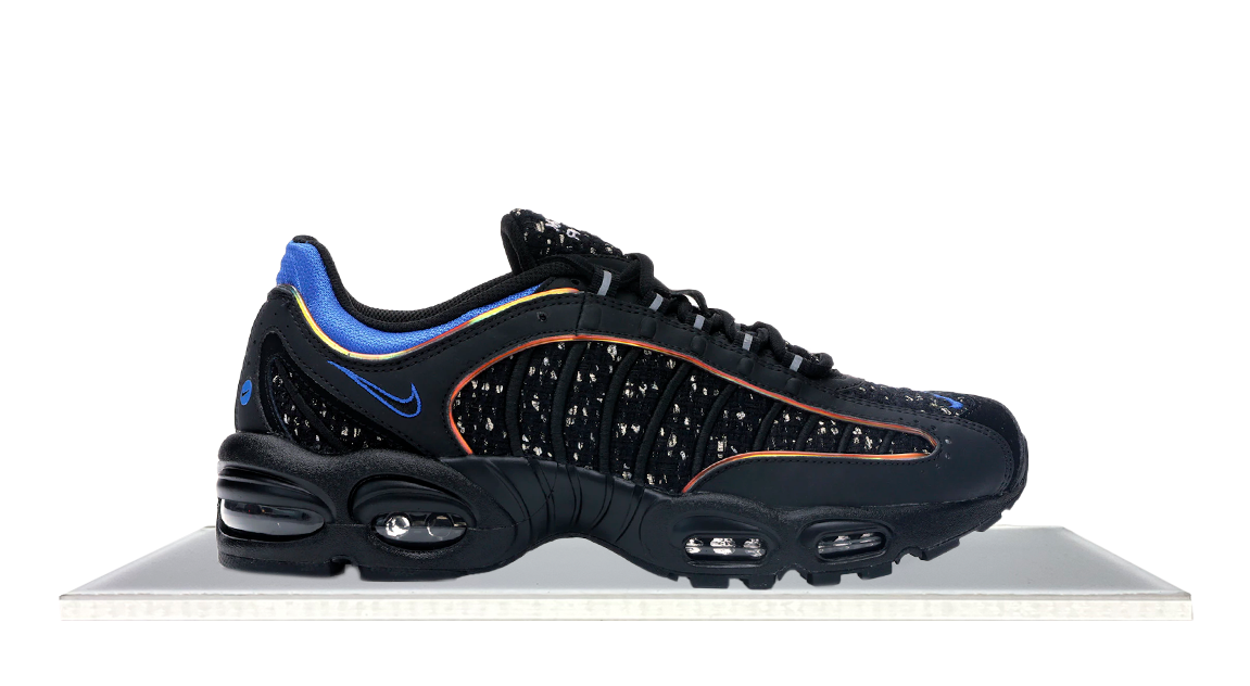 Supreme and Nike collaborated on the Nike Air Max Tailwind 4 Supreme Black. This sneaker features a black upper with blue accents, a black Nike Swoosh with blue outlining, and a black midsole and sole. Released in March 2019, it combines classic design with Supreme’s streetwear flair.