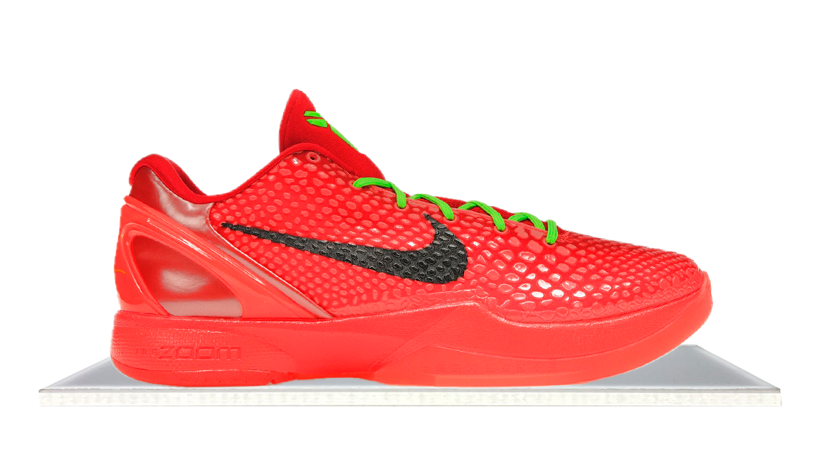 Step into the future with the Nike Kobe 6 Protro Reverse Grinch, a homage to Kobe Bryant's legacy. Featuring a vibrant Bright Crimson upper, snakeskin-textured detailing, and Electric Green accents, this sneaker showcases a bold twist on the iconic Grinch colorway. It's a standout piece in any collection, blending style and tribute.