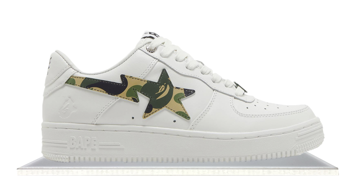 The Bape Sta in a white and "Camo Green" color combo with white on the base and a Green camo Bape motif star on the side. A small Bape motif on the lateral heel also appears.