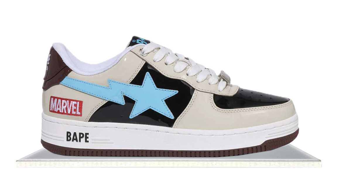 Part of a six pair lineup from Bape, honoring some of the recent and most celebrated personalities from the Marvel comic book universe. This sneaker is featuring one of the newcomers to the collaboration between Marvel and Bape, Rocket Raccoon. It features a patent leather build with a black base with beige overlays, while darker brown details are seen at the outsole and on the heel. A bright light blue is shown on the star on the side, and branding on tongue. Lastly Rocket Raccoon is portrayed on the lateral heel.