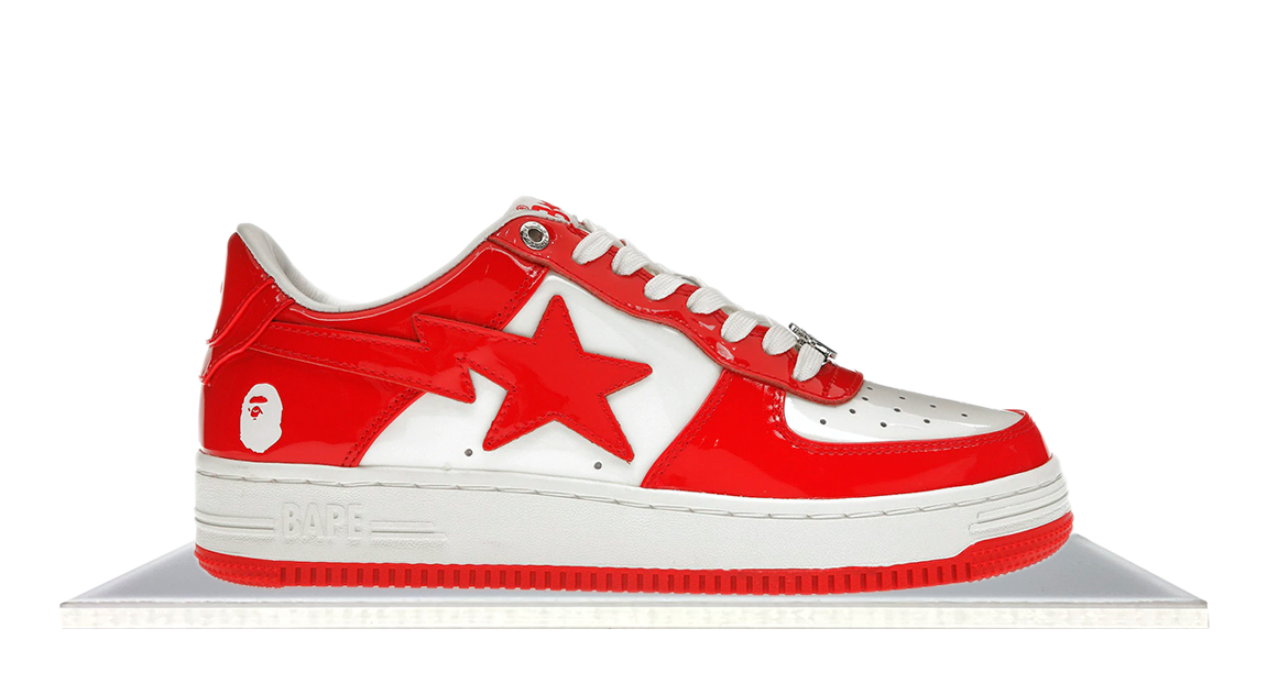 The Bape Sta in a white and red color combo with white on the base and blue on the patent leather overlays. A small Bape motif on the lateral heel also appears.