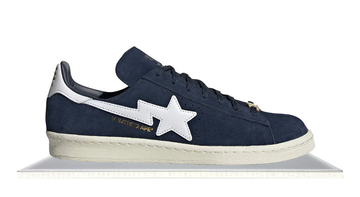 Bape has once again collaborated with Adidas, this time on the Adidas Campus. The sneaker first released in the 1980s, and has since then been a favorite at Adidas. This collab comes with a navy suede base, Bape’s shooting star logo on one side, and the three Adidas stripes on the other, both in white. Gold branding is seen on the bottom of the laces, on the side of the sneaker and on the heel.