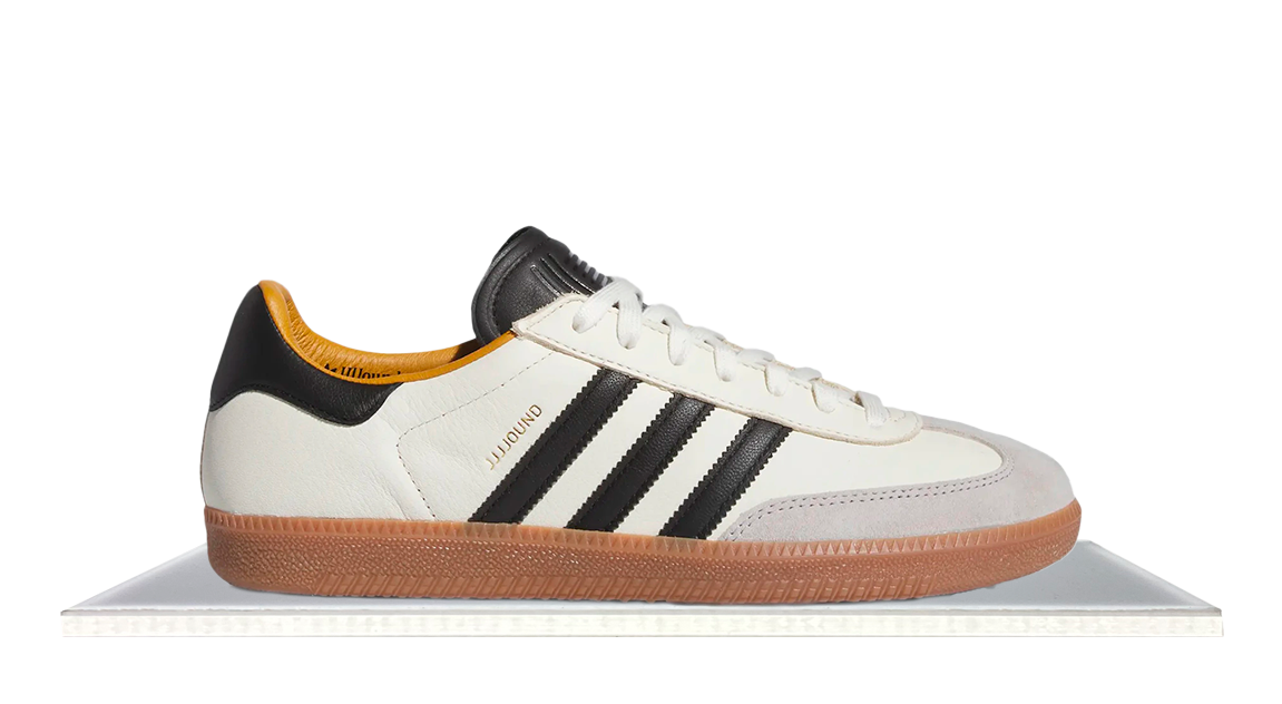 The JJJJound x adidas Samba OG 'White' offers a premium take on vintage soccer style. Crafted in Germany, it features an off-white leather upper with tonal suede overlays. Black accents and gold foil lettering add contrast and sophistication, while a low-profile gum rubber cupsole provides traction and durability.