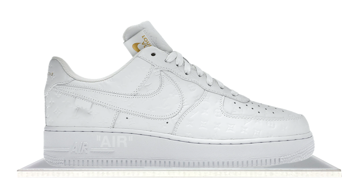 The Louis Vuitton x Nike Air Force 1 Low by Virgil Abloh in White reimagines the classic Air Force 1 in premium LV-stamped leather. Gold Louis Vuitton branding accents the minimalist design, while Abloh’s signature Off-White details, including a small hangtag and “AIR” text, add distinctive touches. Released posthumously, this all-white colorway is part of Abloh’s final collection with Nike, making it a highly sought-after collector’s piece and a lasting tribute to his legacy in fashion and design.