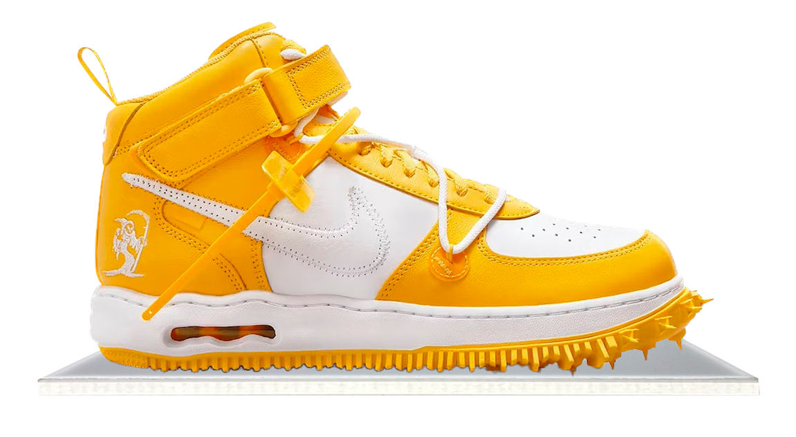 Introducing the Off-White x Nike Air Force 1 Mid "Varsity Maize" collaboration. Crafted with premium yellow leather, it features white accents, Swooshes, and midsole. Inspired by Track and Field, it boasts a unique spiked outsole design. Elevate your sneaker collection with this striking release.