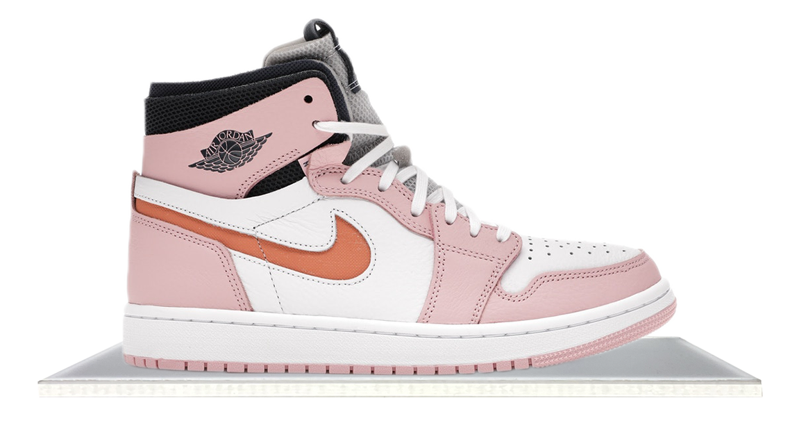 The Air Jordan 1 High Zoom CMFT in a Pink glaze colorway. The Pair features a white leather upper with pastel pink on the overlays. an Orange swoosh adds some contrast together with the black that appears throughout.