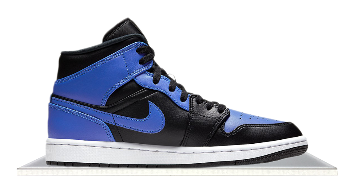 The Air Jordan 1 Mid Black Royal is a nod to the iconic 1985 Royal Air Jordan 1. It combines black tumbled leather with royal blue overlays, a white midsole, and black rubber outsole. Classic Air Jordan details include the Wings logo and Nike woven tag on the tongue.