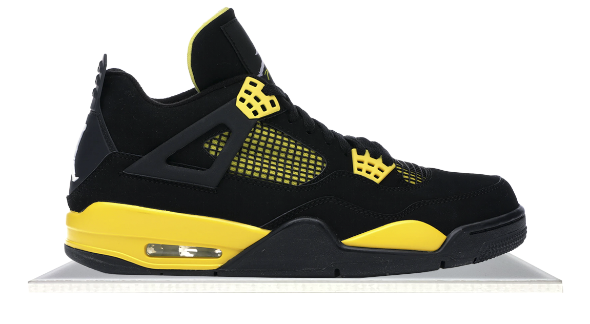 First released in 2006, then in 2012 and now in 2023 the Air Jordan 4 Yellow Thunder is back. It features a black nubuck upper, with details in bright tour yellow on midsole, eyelets and under the netting. White Jumpman branding is seen on the heel and tongue.
