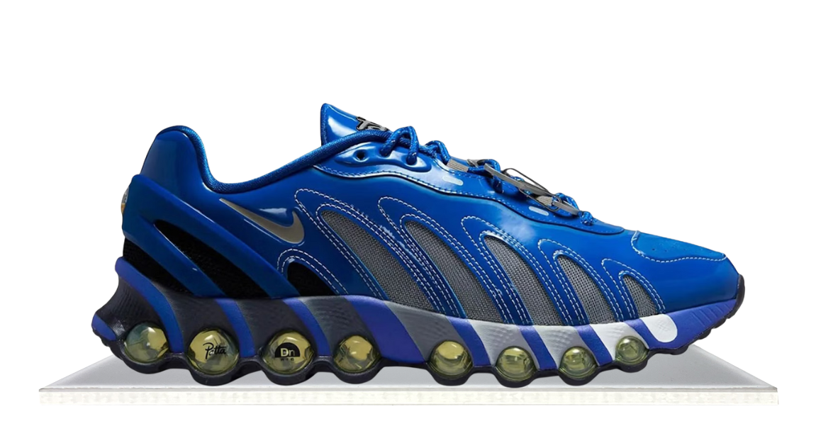 The Patta x Nike Air Max Dn8 Game Royal Metallic Silver celebrates Patta’s creative legacy with Nike through a bold, futuristic design. Featuring a blue patent leather base with silver and black mesh details, it’s accented by a white Swoosh and yellow Dn branding.