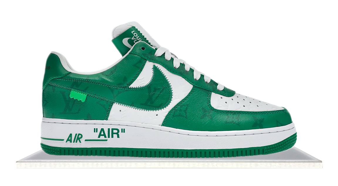 The Louis Vuitton x Nike Air Force 1 Low by Virgil Abloh in White Green blends luxury with streetwear. Released on July 19, 2022, this sneaker features a crisp white leather base with bold green accents, embodying Abloh's innovative, boundary-pushing design. This collaboration celebrates Abloh’s legacy, combining high-end fashion with the timeless appeal of the Air Force 1.