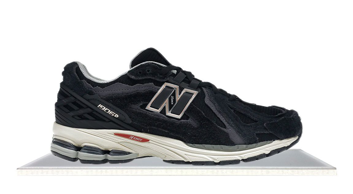The New Balance 1906D Protection Pack Black features a sleek all-black design with white accents. Its mesh and leather upper provide durability and breathability, while the ABZORB and C-CAP midsole offer cushioning and impact protection. Finished with a rubber outsole for grip, it sports prominent "N" logos and "NB" branding.