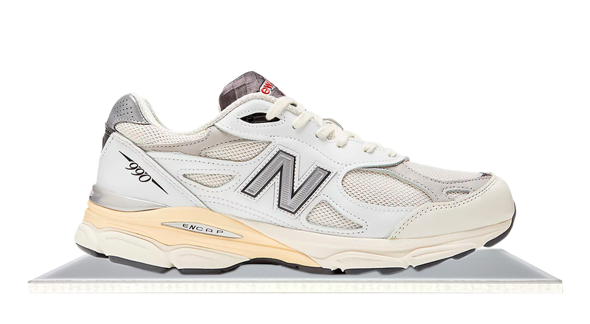 The fantastic 990V3 in a Sea Salt colorway with off white premium mesh, leather, and suede. Reflective material on the New Balance logo and heel cap adds the finishing touch.