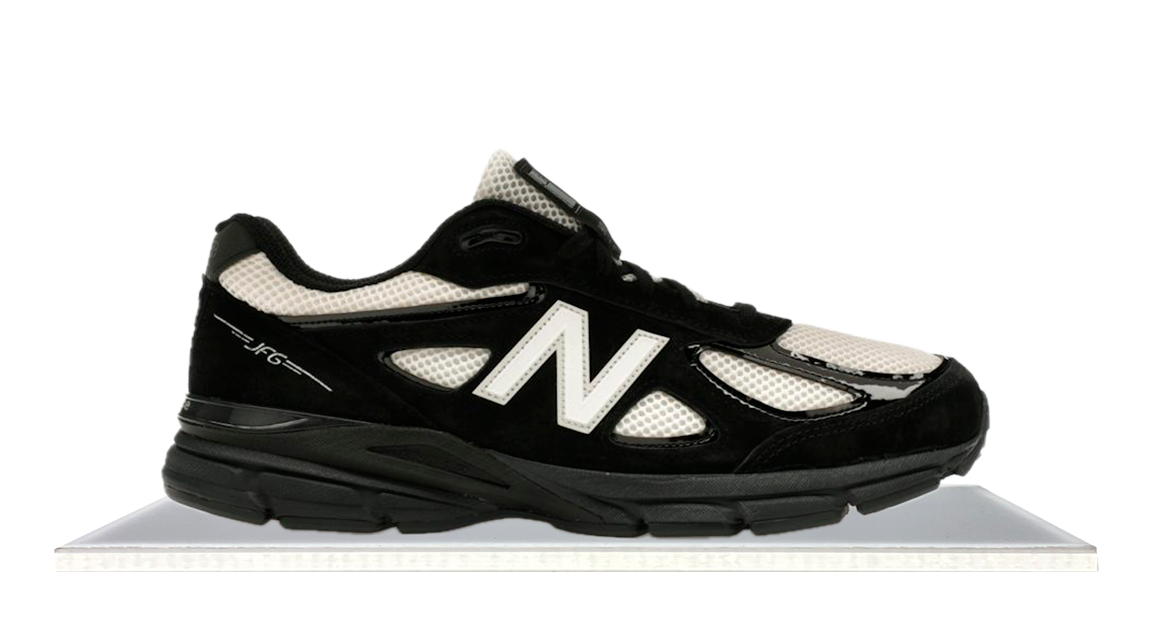 Part of the collaborative '1998 Pack,' the Joe Freshgoods x New Balance 990v4 Made in USA 'Outro' presents the retro runner in a timeless two-tone scheme. The combination of white mesh, black suede overlays, and patent leather detailing forms a classic aesthetic. The ENCAP midsole, painted black, ensures a blend of soft foam cushioning and durable polyurethane support. Iconic branding elements include a white 'N' logo on the quarter panel and 'JFG' printed on the lateral heel.