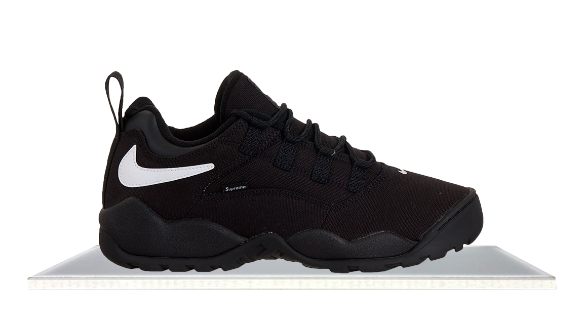 The Supreme x Nike Darwin Low SB 'Black' revives a '90s basketball classic in collaboration with Tinker Hatfield. With a sleek black canvas upper, reverse grey leather Swoosh, and dual branding on the tongue, it's finished with a black polyurethane midsole and durable rubber outsole.