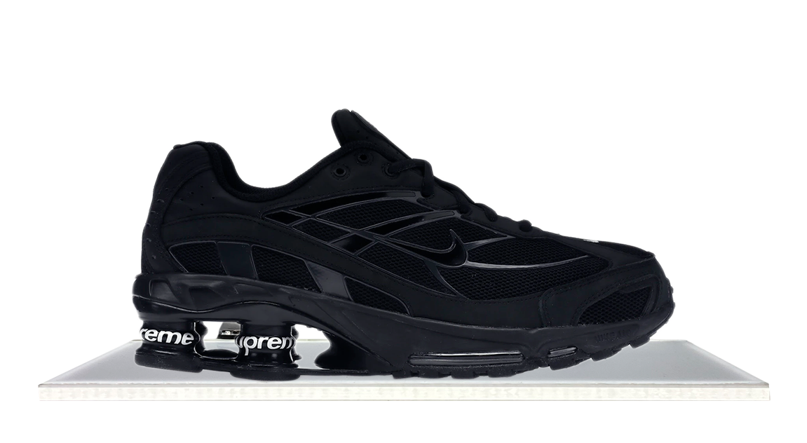 The Nike Shox Ride 2 Supreme Black features a sleek triple black design with mesh, suede, and leather construction. Reflective detailing and webbed paneling enhance its aesthetic, while DURAPLUSH tongues and sock liners ensure comfort. Completing the look are black Nike Shox units with Supreme branding under the heel.