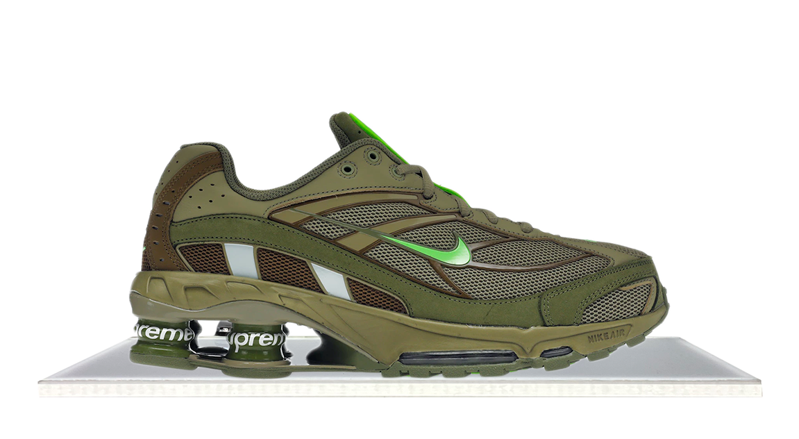 The Nike Shox Ride 2 Supreme Olive features an olive green design with mesh, suede, and leather construction. Reflective detailing and webbed paneling enhance its aesthetic, while DURAPLUSH tongues and sock liners ensure comfort. Completing the look are olive green Nike Shox units with Supreme branding under the heel.