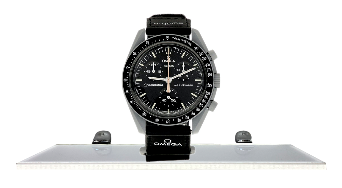 The Omega X Swatch MoonSwatch is one of the most surprising and intriguing watch releases of 2022. This is one of more than 15 watches released and is one of the most sought-after of them all. The “Mission to Moonshine Gold” edition features a combination of black and grey tones, and has a black velcro strap. All writing and details are in grey tones. The chronograph subdial hands and seconds hand are in grey and then one in gold.