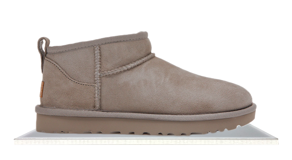 The UGG Classic Ultra Mini Boot, dressed in a grey "Goat" colorway. The UGG Classic Ultra Mini Boot features a Twinface sheepskin upper, a Suede heel counter with a rear pull tab, upcycled wool, a lyocell insole, a Foam footbed, and a Treadlite outsole.