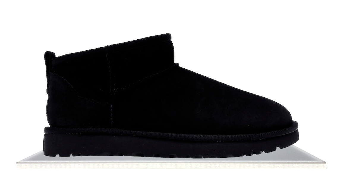 The UGG Classic Ultra Mini Boot, dressed in an all black colorway. The UGG Classic Ultra Mini Boot features a Twinface sheepskin upper, a Suede heel counter with a rear pull tab, upcycled wool, a lyocell insole, a Foam footbed, and a Treadlite outsole.